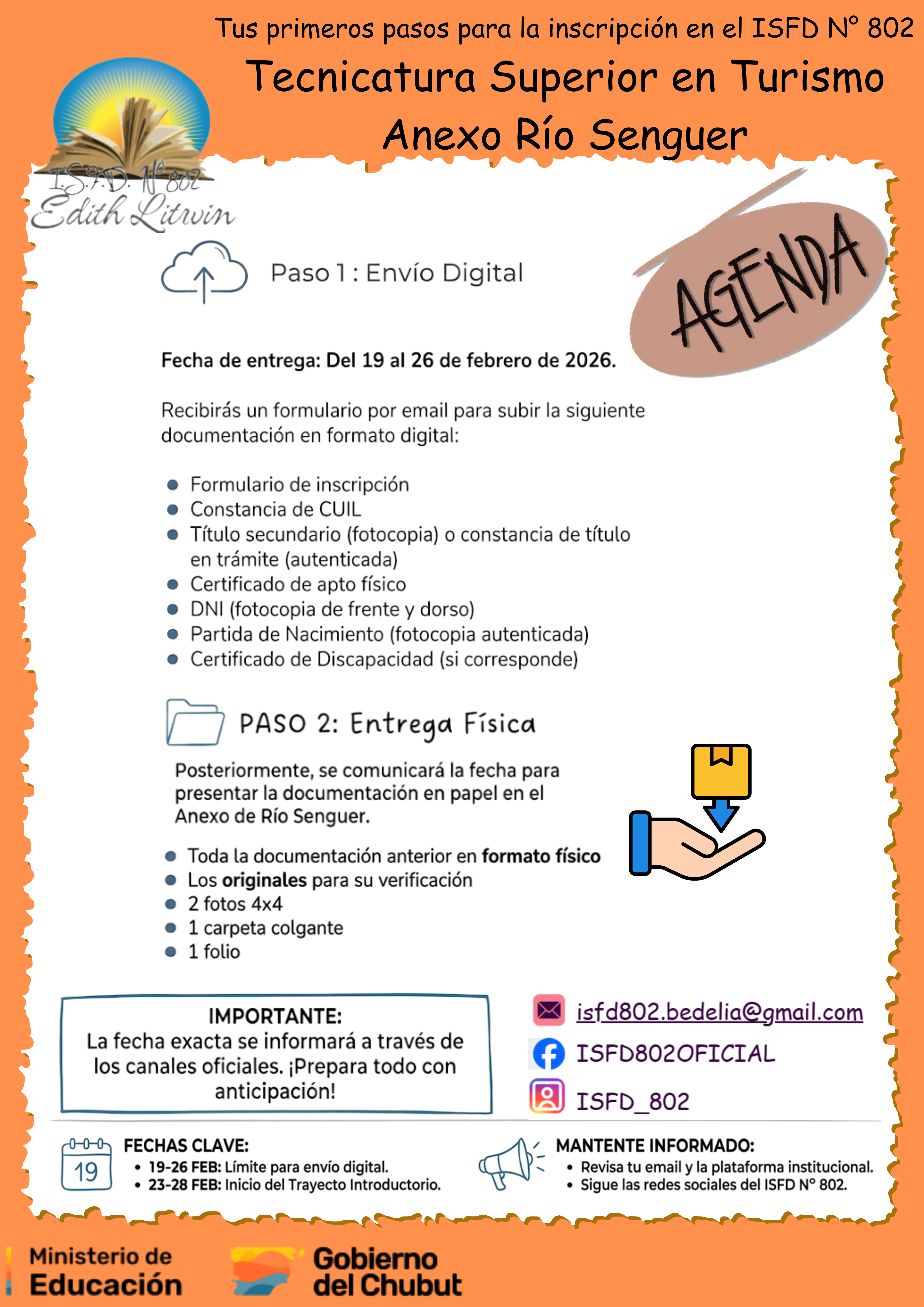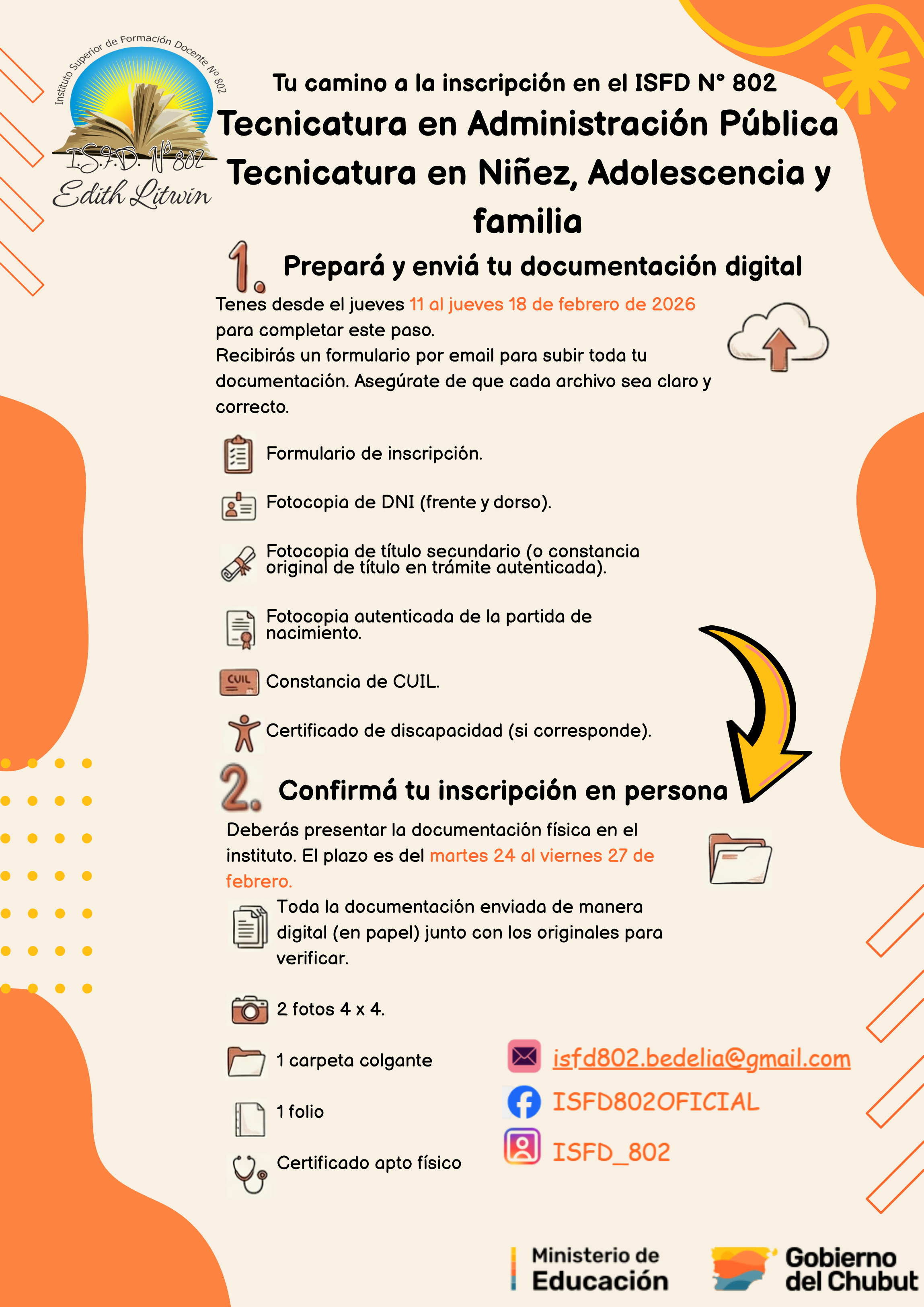 📌Entrega documentación física con originales a partir del 19/02/26 hasta el 26/02/26. Horario de atención de 18:00 hs a 21:00 hs. Planta baja del ISFD N° 802.